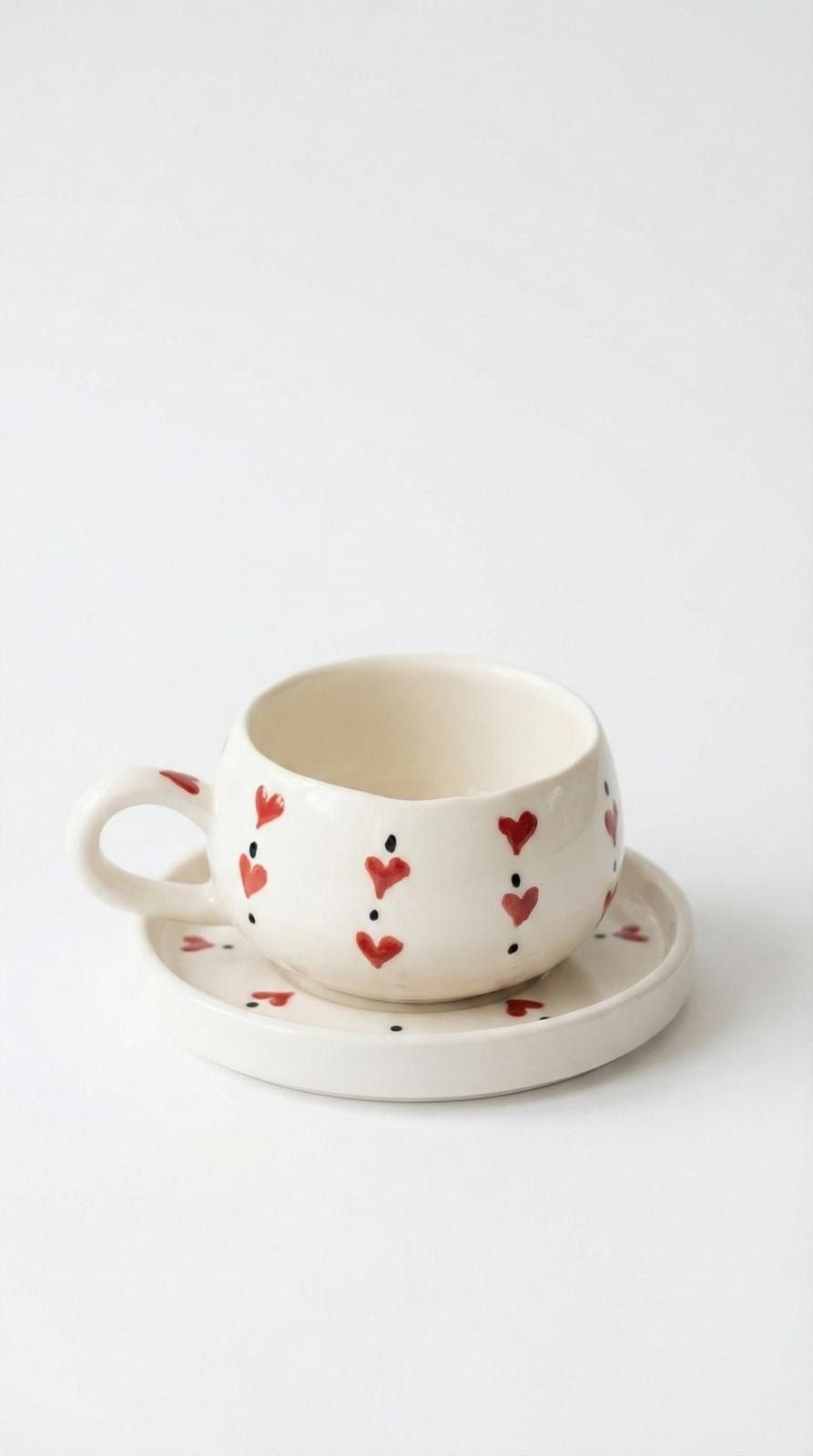 Seramik El Yapımı Çay & Kahve Fincan Seti | Kalp Desenli