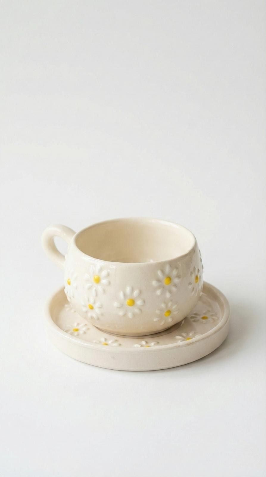 Seramik El Yapımı Çay & Kahve Fincan Seti | Papatya Desenli